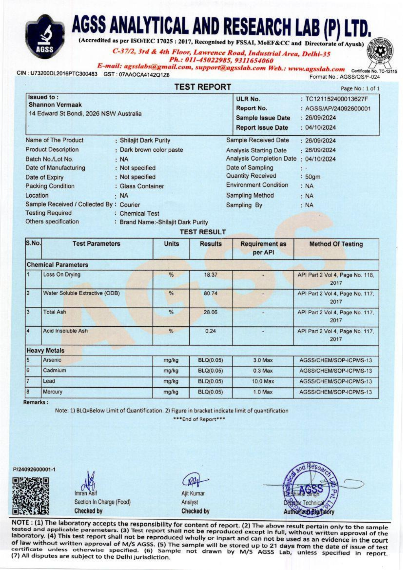 - Arsenic, Cadmium, Lead, and Mercury: All are below the quantifiable limit, confirming the product is free from harmful contaminants and safe for consumption.