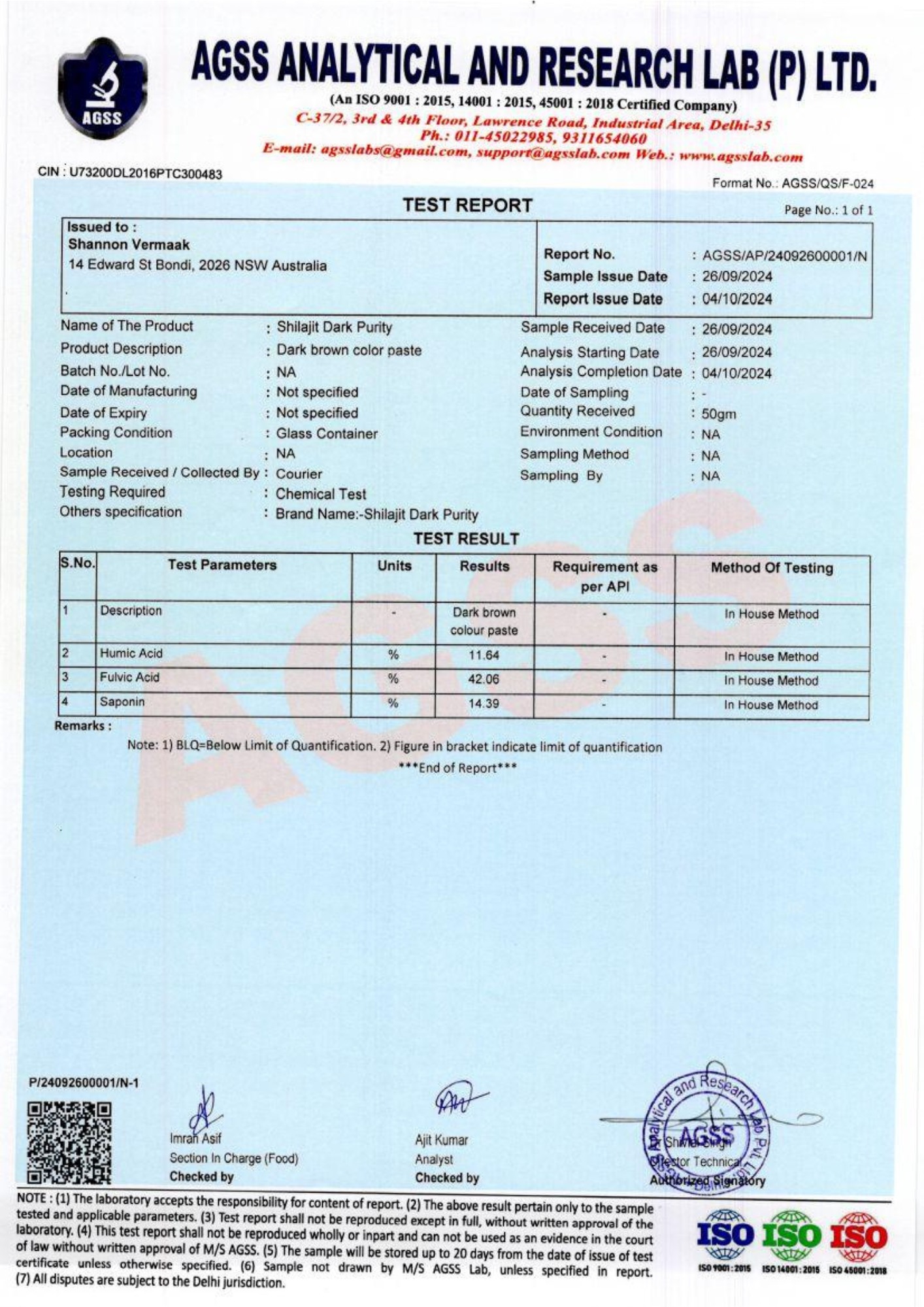 - Total Ash Content: 28.06%, measuring the mineral content, which is expected from high-quality Shilajit.